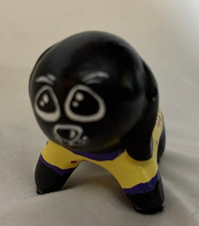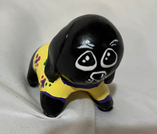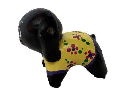 Expertly crafted black and yellow Chochi black dog in small size. Features a distinctive color-black with yellow shirt design that creates visual interest. Material: Plaster, full cast, painted with acrylic paint. 3" x 1 ½"