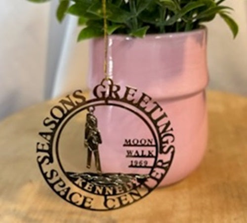 Expertly crafted with brass, this ornament commemorates the monumental 1969 moon walk at Kennedy Space Center. A must-have for space enthusiasts and history buffs, this ornament will add a unique touch to any holiday decor. Own a piece of history with this stunning ornament. Size 2 ¾”