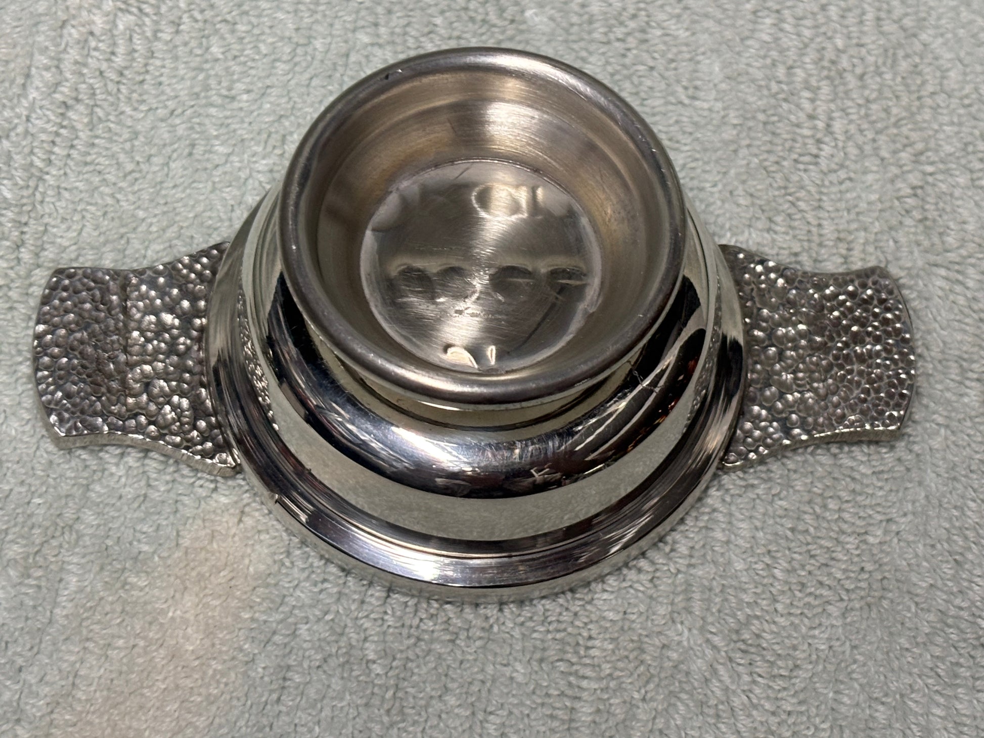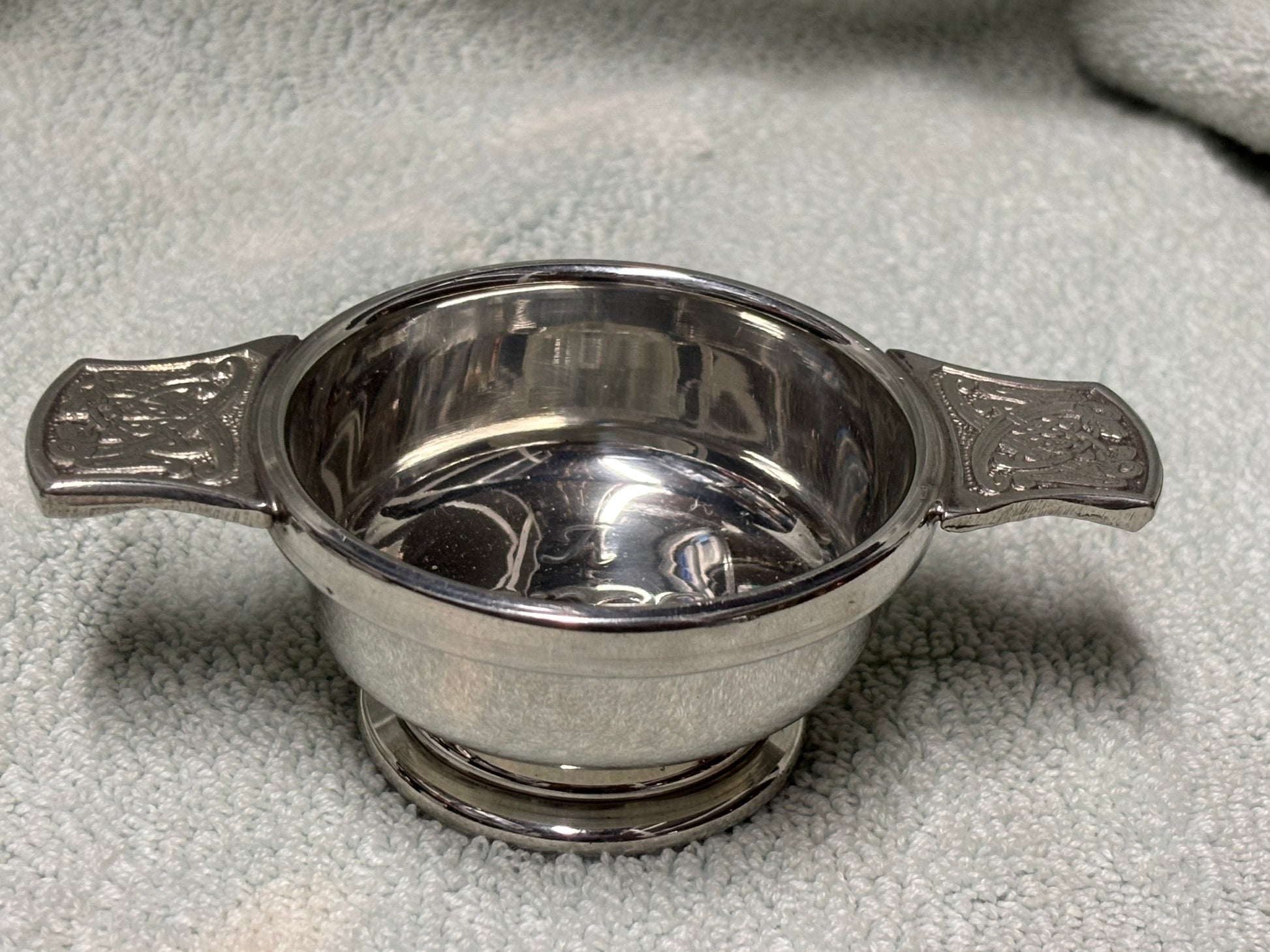 The Quaich Scottish Drink Cup is the perfect vessel for enjoying a traditional Scottish "wee dram" of your favorite beverage. Crafted with precision and detail, this authentic cup adds a touch of Scottish culture to any occasion. Cheers to the perfect blend of practicality and tradition. Size width 3 ¾”