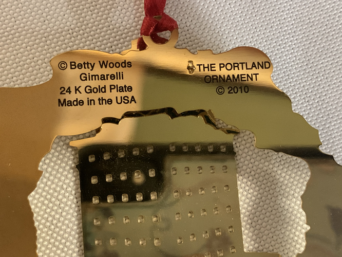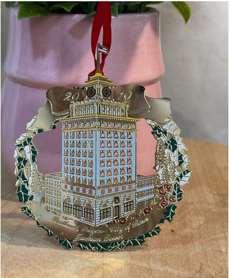 Add some Portland charm to your holiday decor with the 2010 Betty Woods Gimarelli City of Roses Jackson Tower ornament. Featuring a beautiful portrayal of the iconic tower and the city's nickname, this ornament is a must-have for any collector. Made with high-quality materials and expert craftsmanship, it is a timeless piece that will bring joy for years to come. Size 3 ½” x 2 ¾”